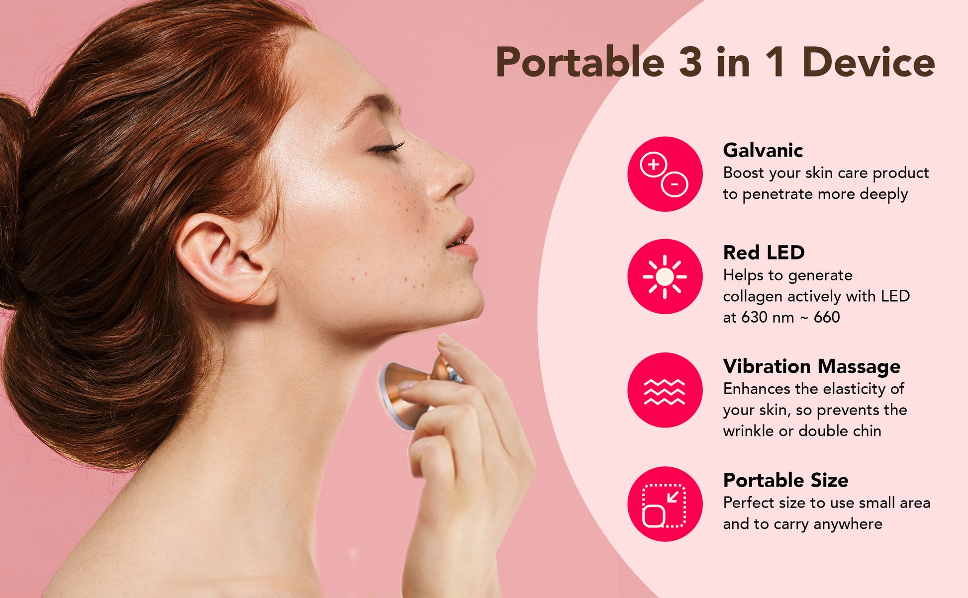 Experience salon-quality skincare at home. This compact device uses galvanic therapy, red LED light (630–660 nm), and vibration massage to boost absorption of your serums and creams, helping improve elasticity and reduce fine lines.
